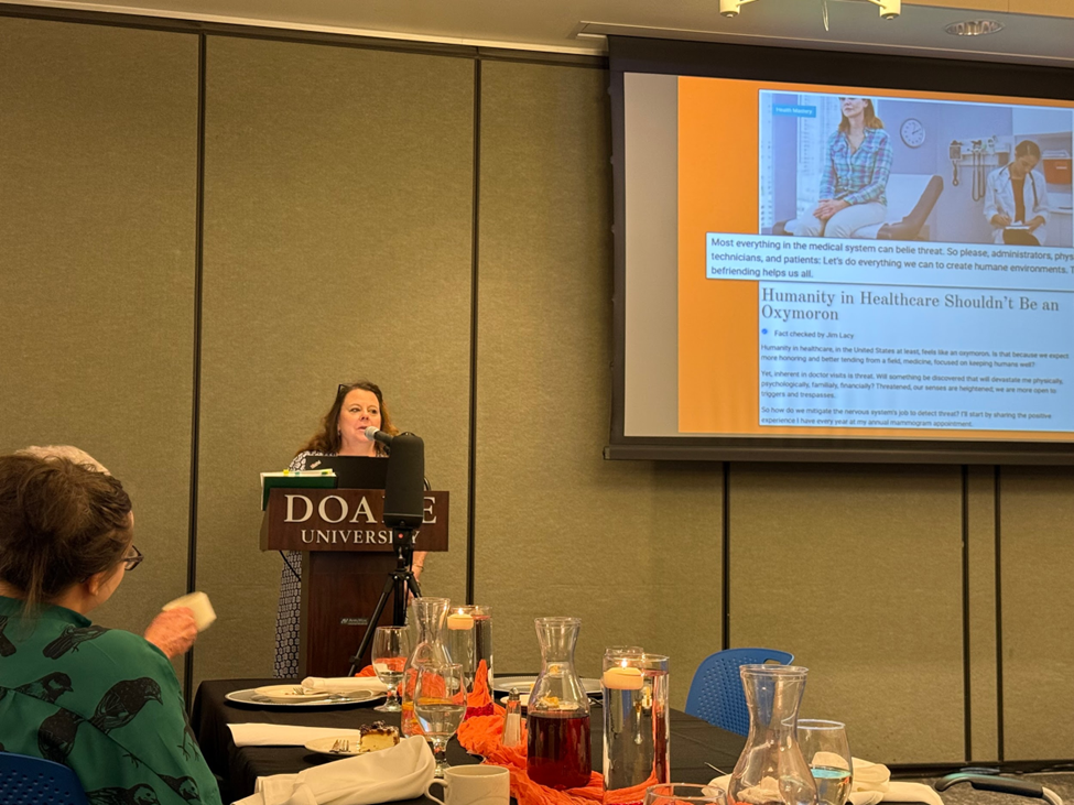 Melanie Ritzenthaler (pictured left), an English professor, has been friends with Amy Fleury (podium) for many years. The slideshow made by Phil Weitl added connecting articles about narrative medicine.