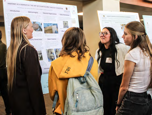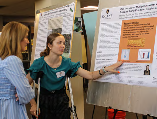 (Top) Students engage in conversations concerning their project. (Bottom) Junior Makinley Thomas presents her research to a faculty member.